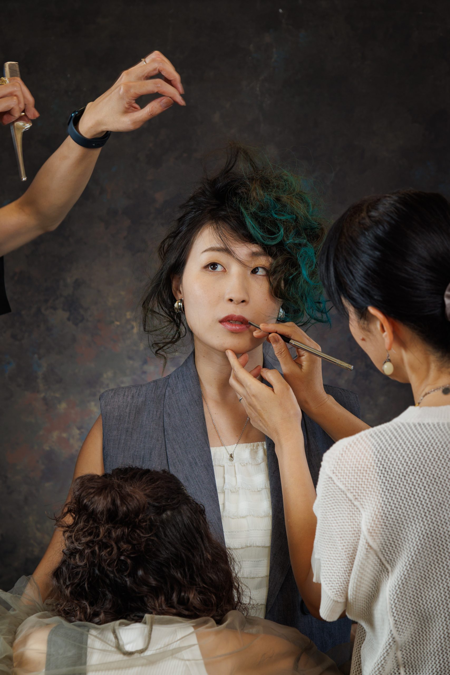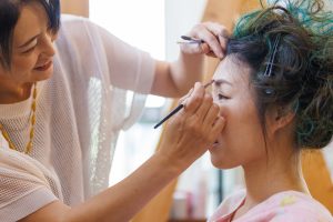 アイシャドウは、グリーンを目尻だけに濃いめに入れたり、原色に近い黄色とハイライトのラメ色を混ぜて黒目の真上のみに入れて立体感を出しリップは映える色味をつけてみたいというご希望に合わせて、はっきりした赤いリップをチョイス。