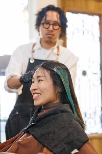 宮岡さんと相談しながら以前、ブリーチしたところを活かしてメリハリのあるビビットな真みどりに!(以前のグリーンはパステルグリーンだったそうです🍃)